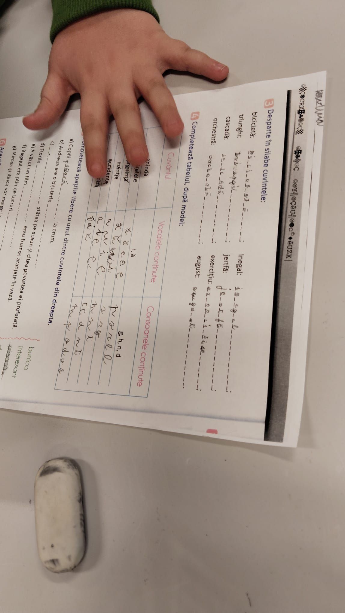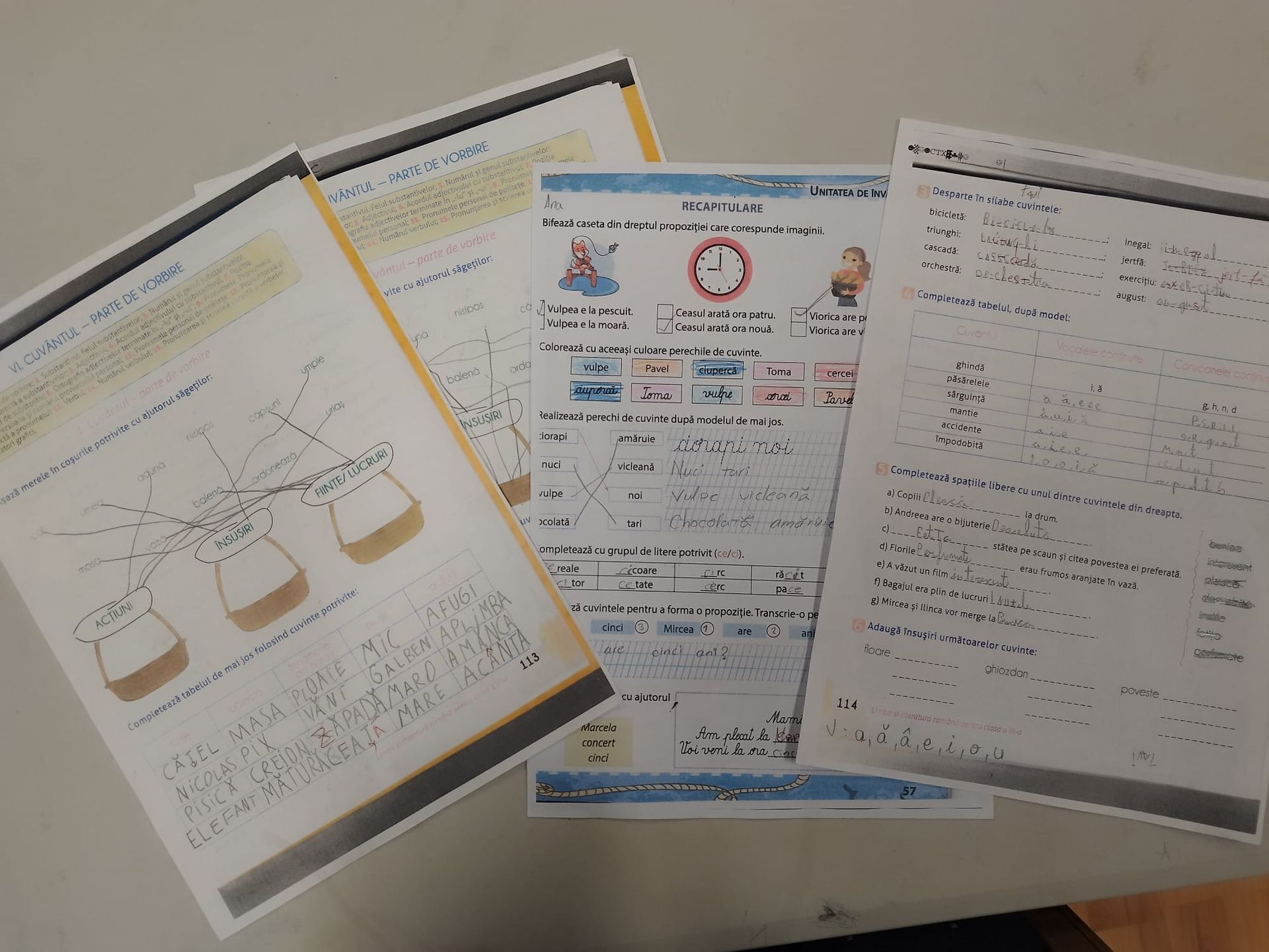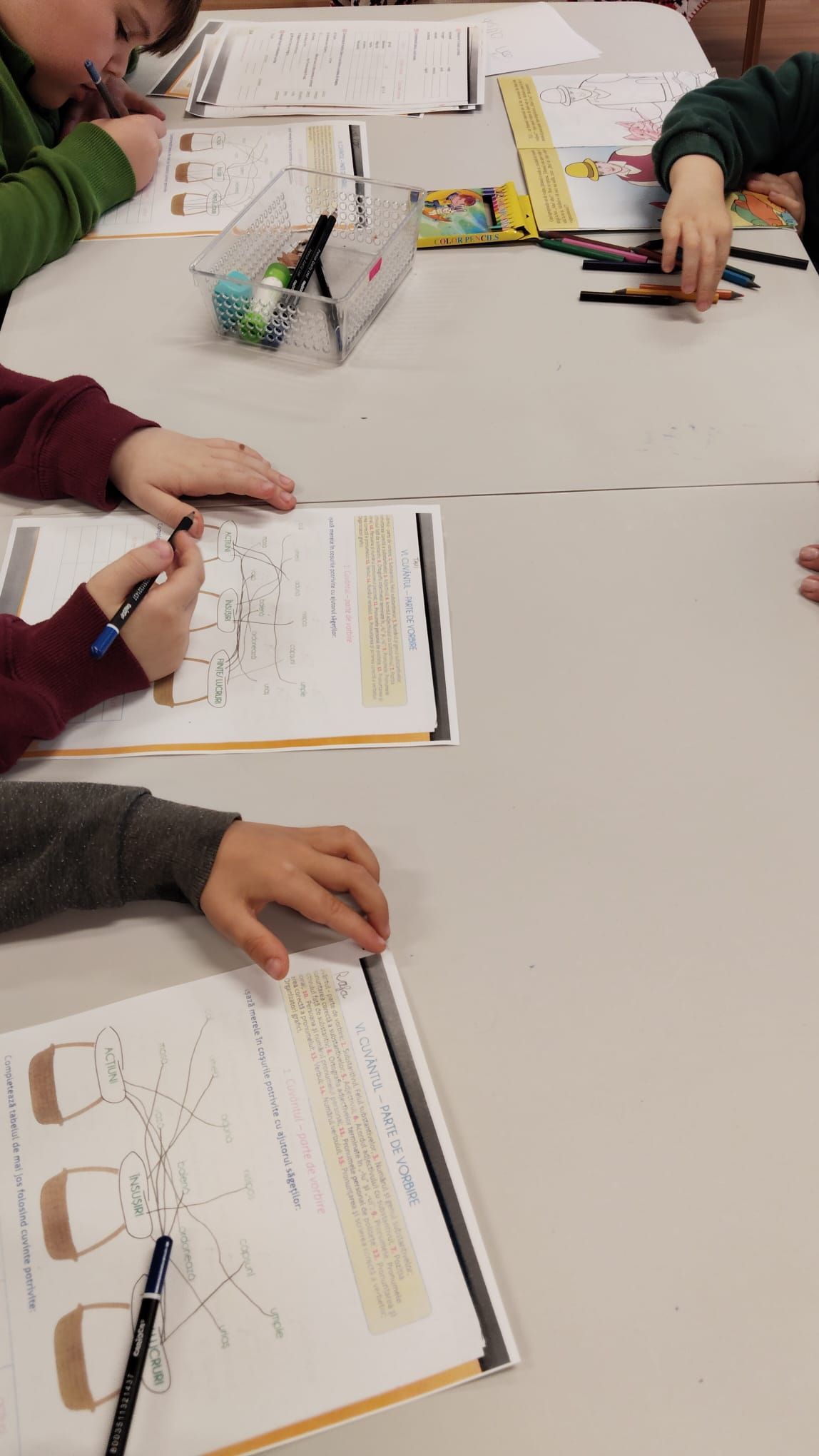 Copiii mai mici au lucrat la gramatică, concentrându-se pe diferențele dintre vocalele „â din a”, „î din i” și „ă”, precum și pe localizarea vocalelor și consoanelor.
