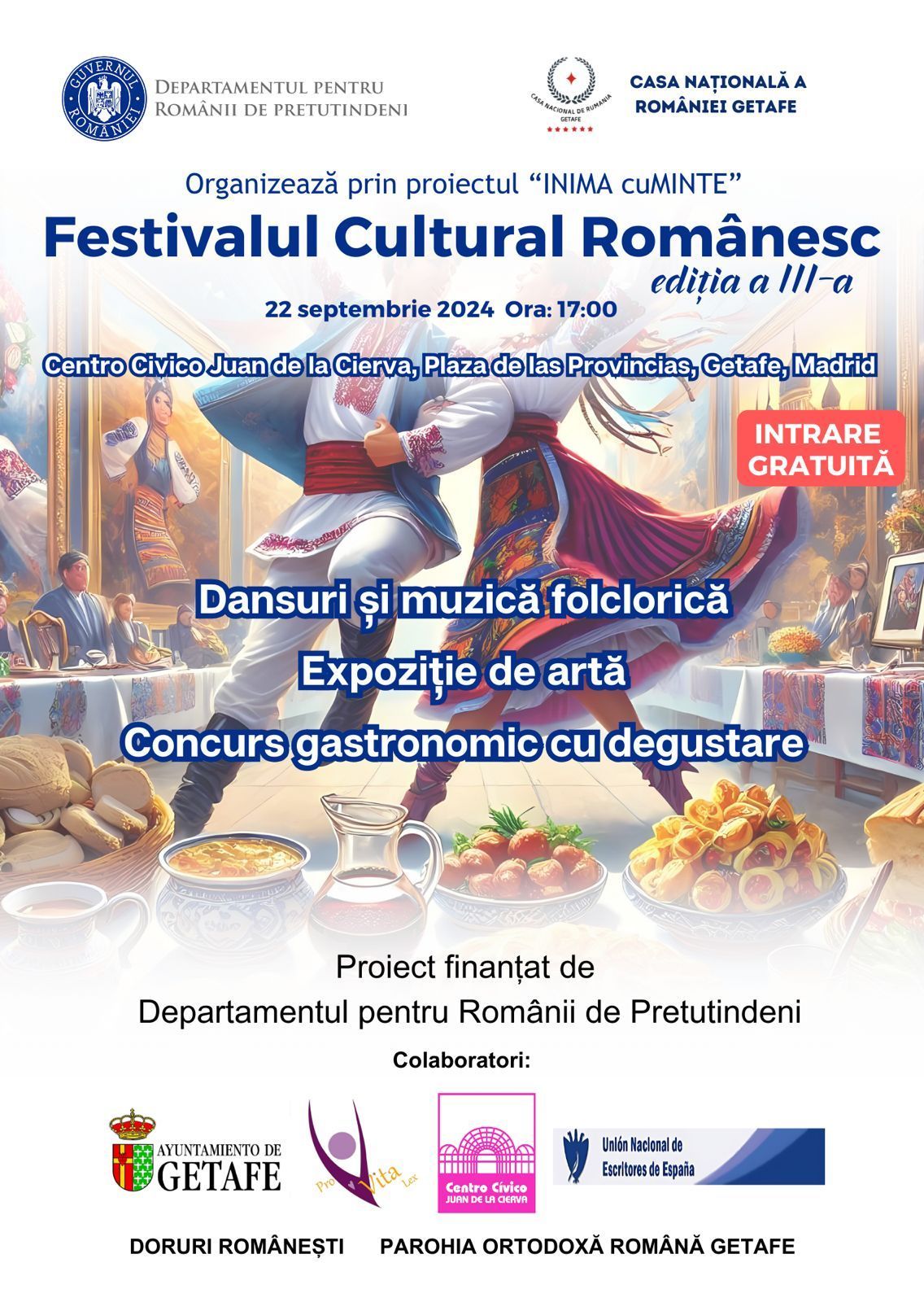 La Asociación Casa Nacional de Rumanía - Casa Nacional de Rumania Getafe organizó la tercera edición del Festival Cultural Rumano. Este año, el festival se enmarca dentro del proyecto titulado "Inimacuminte", llevado a cabo por nuestra asociación en colaboración con nuestro principal socio, el Ayuntamiento de Getafe, el Centro Cívico Juan de la Cierva, y financiado por el Departamento de Rumanos en el Extranjero.