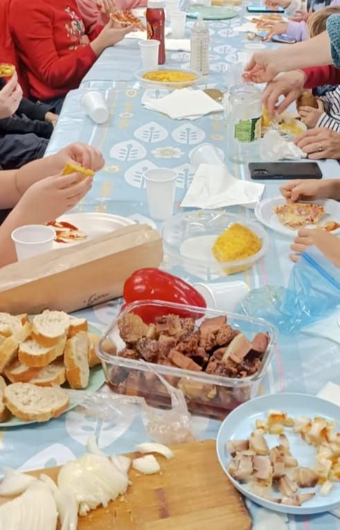 En la segunda parte del evento, todos los participantes, incluidos los padres, disfrutaron de una comida caliente: pizza y chocolate casero, un manjar que nos recordó los sabores de la niñez de muchos de nosotros.