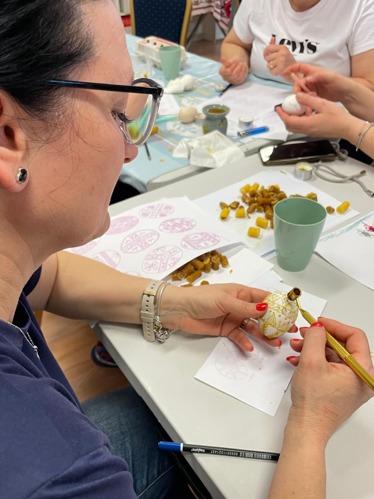 Sâmbătă, 5 aprilie, sub îndrumarea scriitoarei și artistului plastic Ana Ropot, copiii și părinții, îmbrăcați în costume populare și evocând atmosfera satului românesc de odinioară, au participat la atelierul de încondeiat ouă.