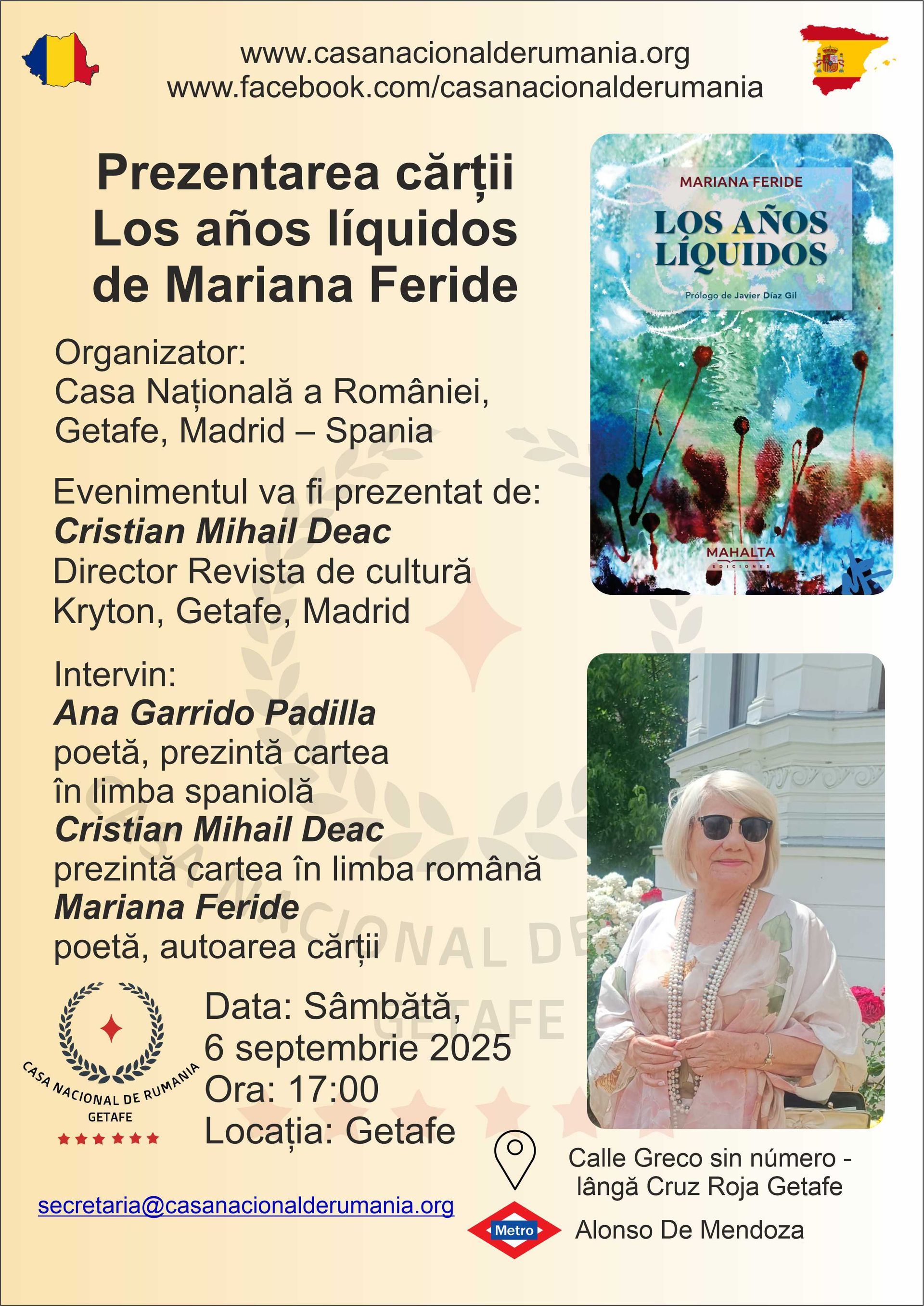 Pe 6 septembrie, la sediul Casei Naționale a României din Getafe, a avut loc prezentarea cărții Anii lichizi, de poeta Mariana Feride. Poetul și preotul Cristian Mihail Deac a oficiat în calitate de prezentator și moderator al evenimentului, care, vizibil fericit, a comentat figura poetei și motivele care l-au determinat să organizeze această întâlnire, menită să fie o punte de dialog, fraternitate și apropiere.