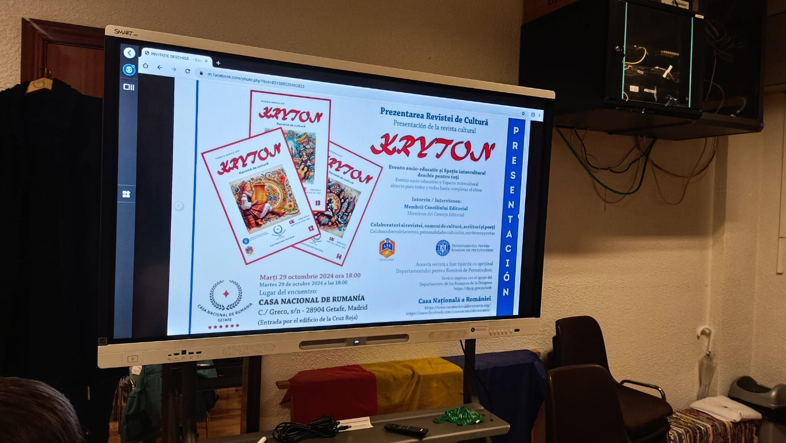 Marți, 29 octombrie 2024, ora 18:00, a avut loc prezentarea oficială a numerelor II și III din acest an ale revistei de cultură Kryton, fondată la Madrid în 2018. Editorul revistei este Casa Națională a României - Casa Nacional de Rumania din Getafe, iar tipărirea sa a fost sprijinită de Departamentul Românilor de Pretutindeni: https://dprp.gov.ro/web/